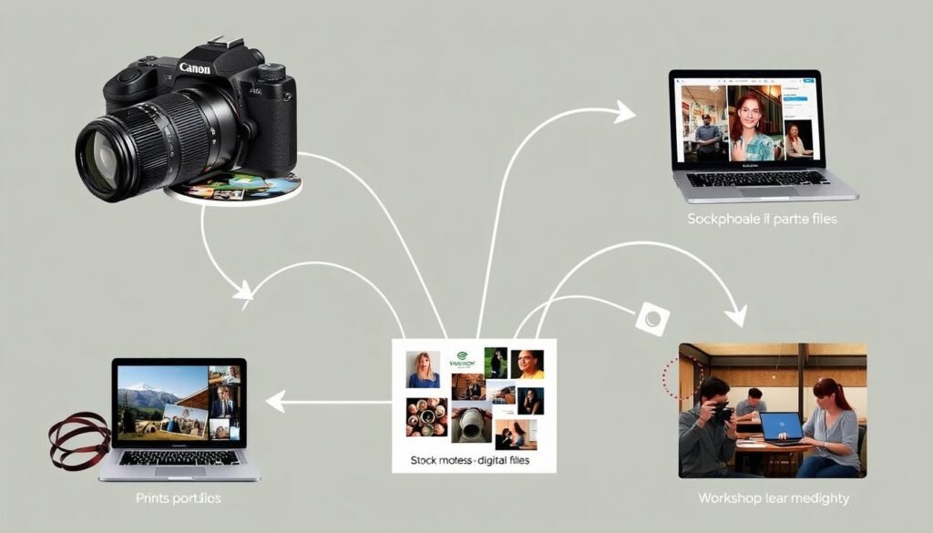 By diversifying income streams, you can lessen your reliance on client commissions. Stock photography offers a steady income. Online courses and print-on-demand services also help you make money from your skills and photos.